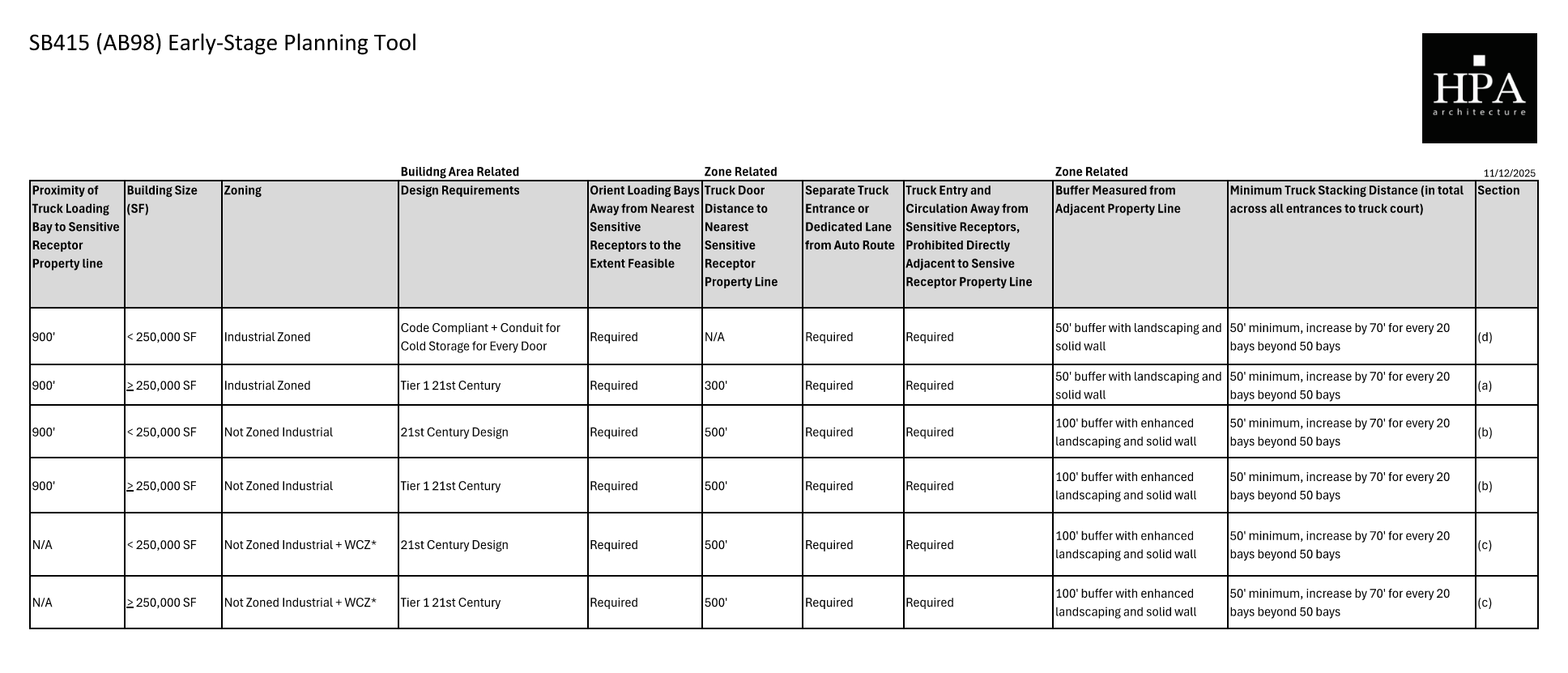 California’s SB 415 (formerly AB 98) reshapes how logistics and warehouse developments are planned and designed near sensitive receptors, setting a new statewide baseline for smarter, more responsible industrial development. Effective January 1, 2026, the legislation introduces requirements for site planning, buffering, truck circulation, and building performance, with standards that vary by project size, zoning, and proximity to surrounding uses. Many projects will also be required to meet the new “21st Century” or “Tier 1 21st Century” logistics facility criteria, raising expectations for energy performance, electrification readiness, and long-term operational sustainability.