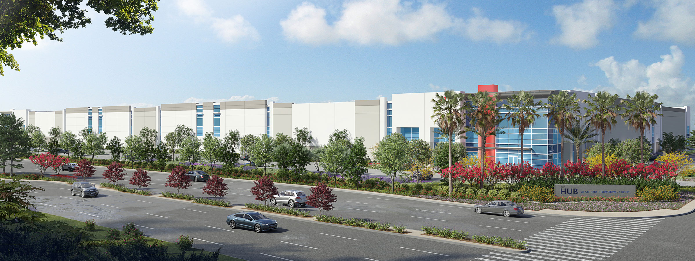 A signature architectural element of the project is the light tower at the main entrance of each building, featuring three distinct color schemes. These towers are illuminated at night, giving each structure a unique identity and setting the development apart from conventional warehouse complexes.